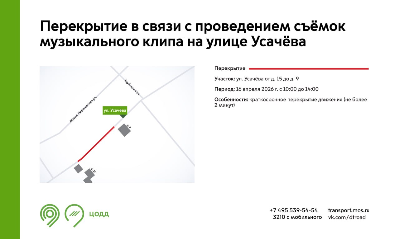 - с 10:00 до 14:00 участок улицы Усачёва будет закрыт для проезда (не более 2 минут);