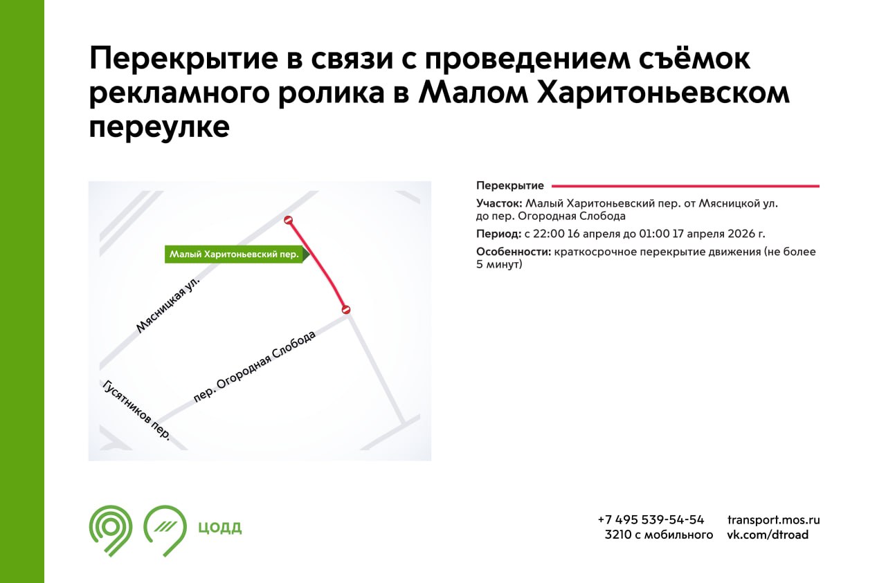 - с 22:00 16 апреля до 01:00 17 апреля участок Малого Харитоньевского переулка будет закрыт для проезда (не более 5 минут).