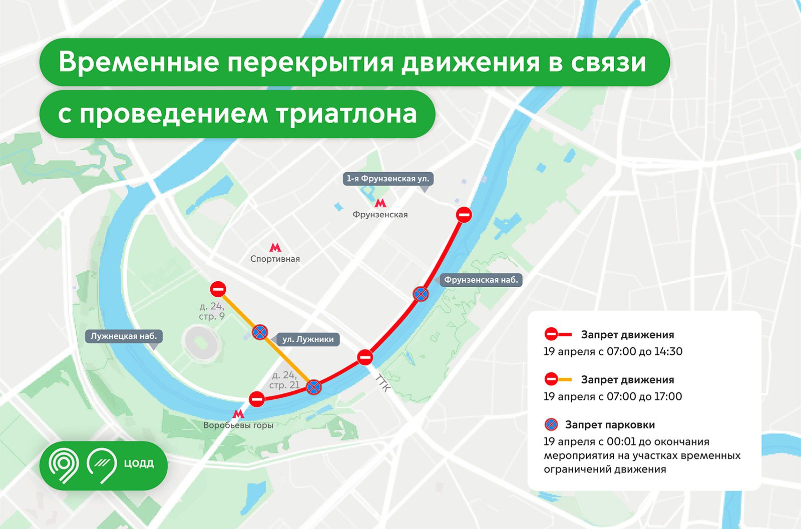 - с 07:00 до 14:30 полностью перекроют движение на Лужнецкой набережной — от дома 24, строения 21 до Фрунзенской набережной, а также на Фрунзенской набережной — от Лужнецкой набережной до 1-й Фрунзенской улицы;